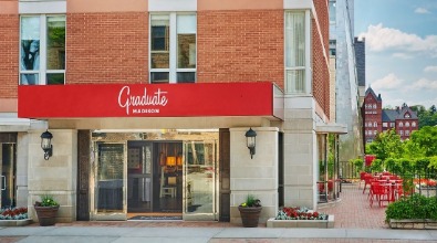 The Graduate Madison is located just steps from Madison’s iconic State Street district’s dining and shopping, and a stone’s throw from the Memorial Union. The Graduate offers unique amenities near the heart of UW-Madison’s campus. Enjoy Camp Trippalindee, a summer camp themed rooftop bar with breathtaking views of the State Capitol and picturesque Lake Mendota, a café serving coffee and all-day breakfast in the lobby, and a 24-hour onsite gym. Enjoy a room design inspired by the lakeshore and college lifestyle complete with cozy beds, workstations, an HD TV, docking stations, and a lounge chair. Valet parking is available.